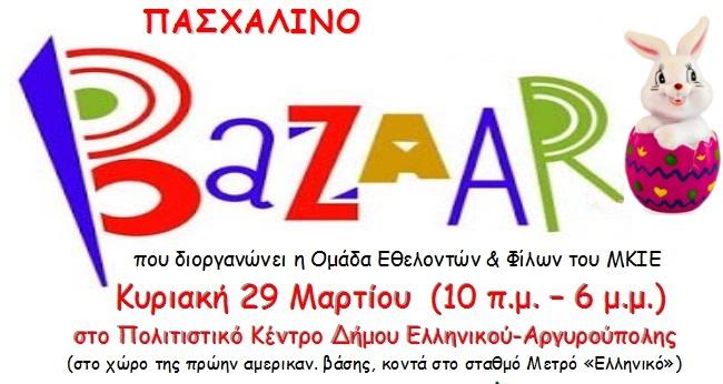 Οι «Φίλοι του Μητροπολιτικού Κοινωνικού Ιατρείου Ελληνικού (ΜΚΙΕ)», εθελοντές και φίλοι, που ζουν καθημερινά από κοντά τον τιτάνιο αγώνα του ΜΚΙΕ να στηρίξει τον άνεργο, ανασφάλιστο και άπορο συνάνθρωπό μας, διοργανώνουν και φέτος λίγο πριν από το Πάσχα ένα Bazaar, την Κυριακή 29 Μαρτίου 2015, (από τις 10.00 μέχρι τις 18.00), στο Πολιτιστικό Κέντρο του Δήμου Ελληνικού-Αργυρούπολης (στο χώρο της πρώην αμερικάνικης βάσης, κοντά στο σταθμό του μετρό «Ελληνικό») και μαζί μια εορταστική εκδήλωση, αφιερωμένη στους μικρούς φίλους του Ιατρείου.