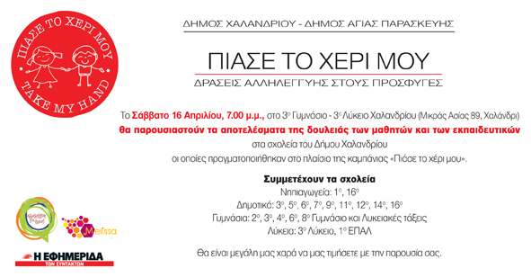 Το Σάββατο 16 Απριλίου, 7.00 μ.μ., στο 3ο Γυμνάσιο - 3ο Λύκειο Χαλανδρίου (Μικράς Ασίας 89, Χαλάνδρι) θα παρουσιαστούν τα αποτελέσματα της δουλειάς των μαθητών και των εκπαιδευτικών στα σχολεία του Δήμου Χαλανδρίου οι οποίες πραγματοποιήθηκαν στο πλαίσιο της καμπάνιας «Πιάσε το χέρι μου».