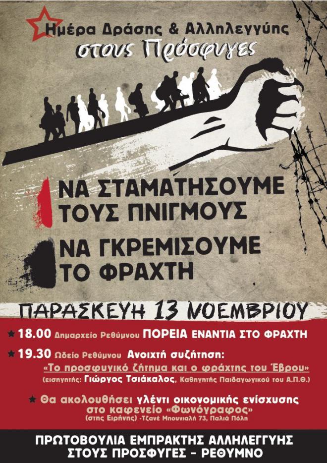 Καλούμε τους συμπολίτες μας να στηρίξουν τη μέρα δράσης και αλληλεγγύης στους πρόσφυγες που οργανώνεται στο Ρέθυμνο την Παρασκευή 13/11.