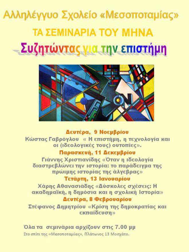 Τα  αλληλέγγυα σχολεία είναι πια μια πραγματικότητα. Σε δεκάδες γειτονιές της Αθήνας και του Πειραιά, στην Θεσσαλονίκη, στις μεγάλες πόλεις της περιφέρειας, στα χωριά και στα νησιά, παντού, οι εκπαιδευτικοί οργανώνονται εθελοντικά για να βοηθήσουν τα παιδιά να καλύψουν τις ανάγκες τους στη γνώση. Τα αλληλέγγυα σχολεία δεν λειτουργούν και δεν πρέπει να λειτουργούν ως εναλλακτικά των φροντιστηρίων. Θέλουν να αποτελέσουν τη βάση μιας εναλλακτικής εκπαιδευτικής πρότασης, να πάνε παραπέρα την εκπαίδευση δημιουργώντας νέα εναλλακτικά μοντέλα. Γι’ αυτό φέτος, εμείς στο Αλληλέγγυο Σχολείο της «Μεσοποταμίας»  προχωρούμε  στην προσπάθεια της διοργάνωσης μιας σειράς επιμορφωτικών σεμιναρίων για τους εκπαιδευτικούς και τους ενήλικους φίλους μας, σεμινάρια ανοιχτά σε όποιον θέλει και ενδιαφέρεται να τα παρακολουθήσει, γιατί τα αλληλέγγυα σχολεία είναι κέντρο δραστηριοτήτων για όλη την γειτονιά, για όλη την περιοχή τους. Τα λέμε «Τα σεμινάρια του μήνα» και θα πραγματοποιούνται μια φορά το μήνα στο «Σπίτι της Μεσοποταμίας».