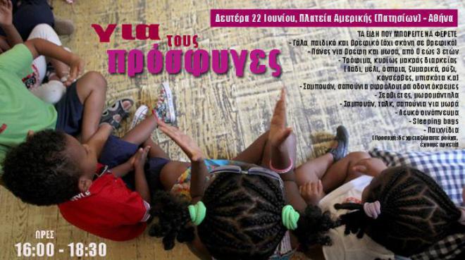Με αφορμή τη Παγκόσμια ημέρα Προσφύγων, είδη πρώτης ανάγκης για τους πρόσφυγες που καταφθάνουν στην Αθήνα συγκεντρώνουν σήμερα στην πλατεία Αμερικής από τις 16.00 ως τις 18.30 εθελοντές σε συνεργασία με την Κοινωνική Κουζίνα «Ο Άλλος Άνθρωπος» που θα μαγειρέψει, ενώ παράλληλα θα μοιράζεται ενημερωτικό υλικό «επιβίωσης».