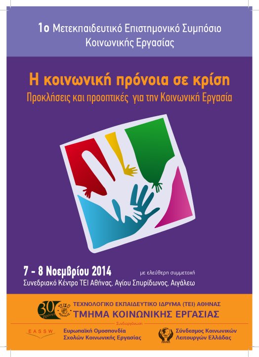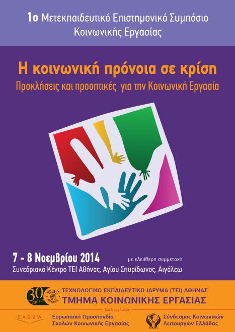 1ο Μετεκπαιδευτικού Επιστημονικού Συμπόσιου στην Κοινωνική Εργασία με Ευρωπαϊκή Συμμετοχή, με θέμα: «Η ΚΟΙΝΩΝΙΚΗ ΠΡΟΝΟΙΑ ΣΕ ΚΡΙΣΗ: ΠΡΟΚΛΗΣΕΙΣ ΚΑΙ ΠΡΟΟΠΤΙΚΕΣ ΓΙΑ ΤΗΝ ΚΟΙΝΩΝΙΚΗ ΕΡΓΑΣΙΑ» που θα πραγματοποιηθεί στις 7 και 8 Νοεμβρίου στο Συνεδριακό Κέντρο του ΤΕΙ Αθήνας (Δ/νση: Αγίου Σπυρίδωνος, Αιγάλεω).
