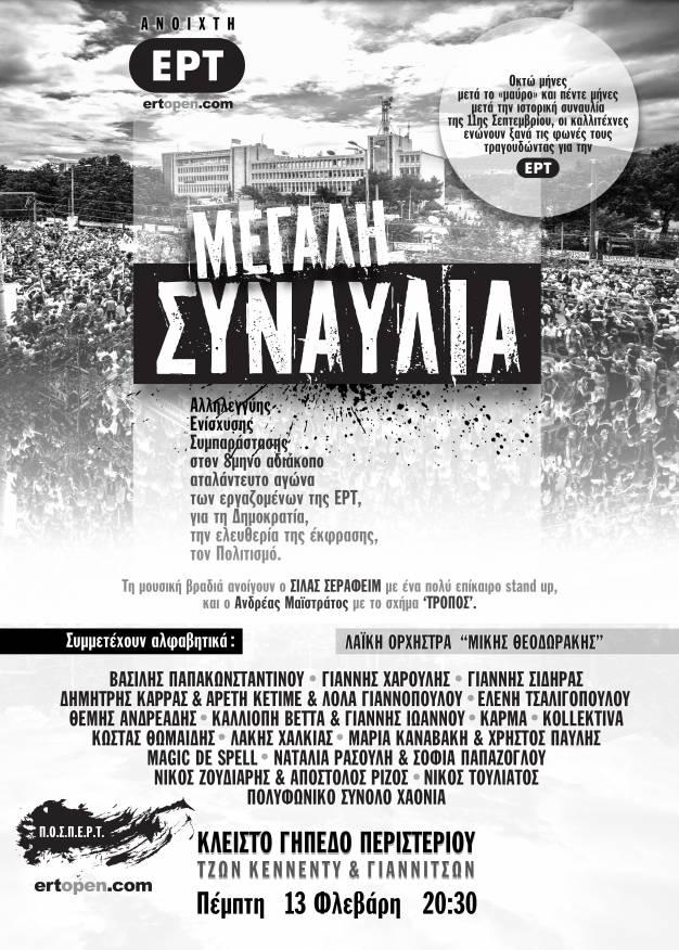 ΣΑΣ ΚΑΛΟΥΜΕ ΣΤΗ  ΜΕΓΑΛΗ ΣΥΝΑΥΛΙΑ ΣΤΗΡΙΞΗΣ  ΚΑΙ  ΑΛΛΗΛΕΓΓΥΗΣ ΣΤΟΝ ΑΓΩΝΑ ΤΩΝ ΕΡΓΑΖΟΜΕΝΩΝ ΤΗΣ  ΕΡΤ