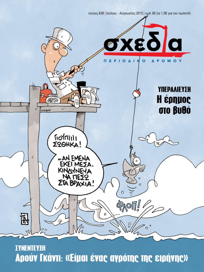 Παίρνουμε συνέντευξη από τον εγγονό του Μαχάτμα Γκάντι, Αρούν, κολυμπάμε σε έρημα νερά, εκτονώνουμε τη φυσική μας ανάγκη στην ανοιχτή θάλασσα χωρίς καμία απολύτως ενοχή, ψάχνουμε τον γιατρό στο κατάστρωμα του πλοίου της γραμμής, βγαίνουμε στα πάρκα της πόλης να παίξουμε πετάνκ, βλέπουμε έγκλειστους φυλακών να εκπαιδεύουν σκύλους και να ασχολούνται με βιοκαλλιέργειες, θαμπωνόμαστε από τα θαύματα που ξεπηδούν μέσα από χαλάσματα, κάνουμε το γύρο του κόσμου με άδειες τσέπες πάνω σε μια μοτοσικλέτα, ακούμε πρόσφυγες να ζηλεύουν τη ζωή στην Ελλάδα και να εύχονται μια μέρα η χώρα τους να φτάσει την Ελλάδα του σήμερα. Αυτά και άλλα πολλά, μόνο στη διπλή «σχεδία» Ιουλίου – Αυγούστου 2015 (τεύχος #28).