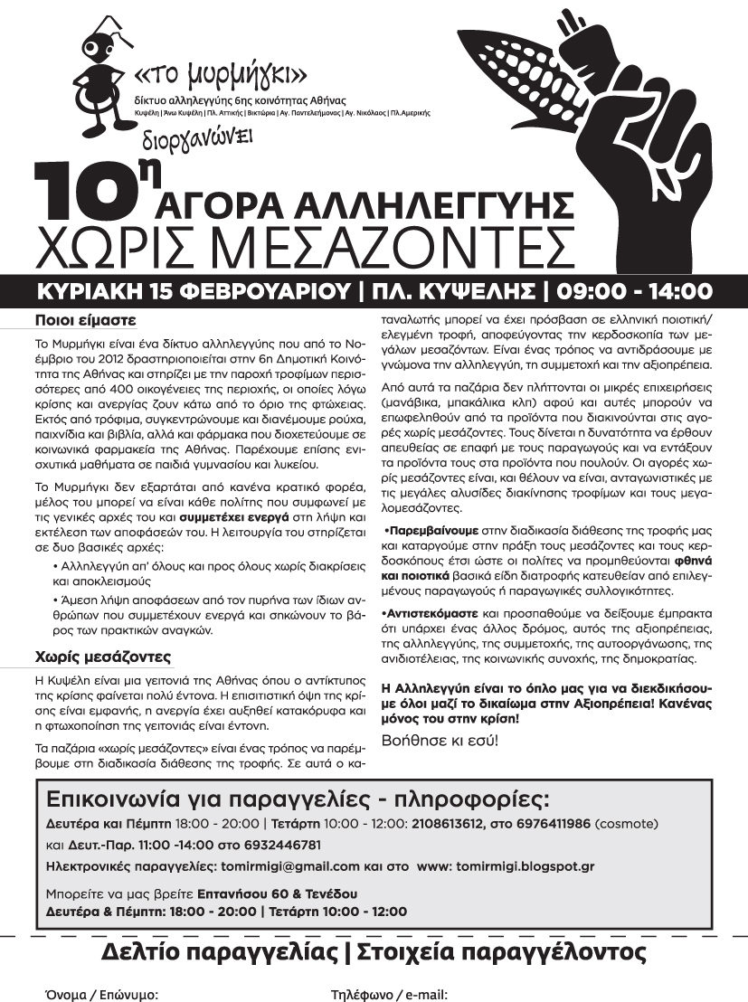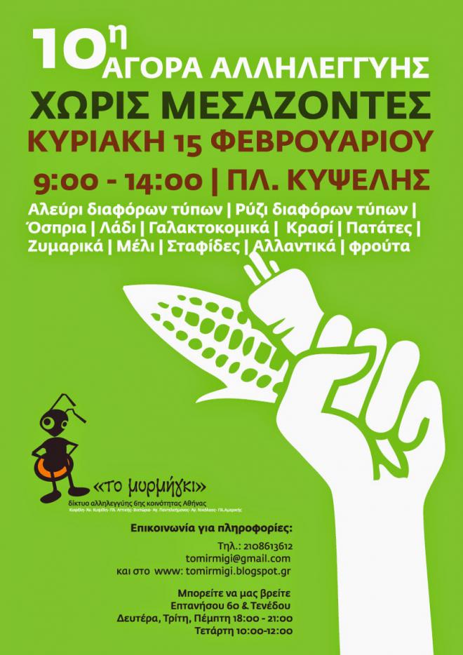 Την Κυριακή, 15 Φεβρουαρίου, 9 με 2 το μεσημέρι, θα γίνει στην πλατεία της Κυψέλης η 10η Αγορά Χωρίς Μεσάζοντες. Θα υπάρχουν όσπρια, λάδι, αλεύρι, τυροκομικά, μέλι, ζυμαρικά, κρασί, πατάτες, φρούτα και πολλά άλλα προϊόντα. Για προπαραγγελίες, μέσω email στο tomirmigi@gmail.com ή στο 6976411986. Σας περιμένουμε