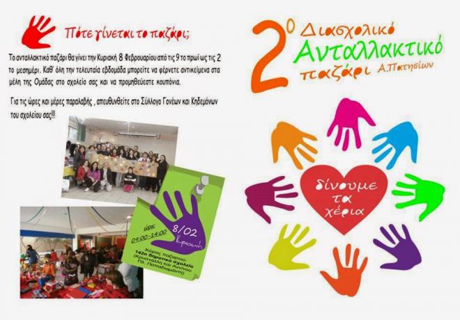 Η Ένωση Γονέων και Κηδεμόνων της 5ης Δημοτικής Κοινότητας Αθήνας, οι Σύλλογοι Γονέων και Κηδεμόνων του 142ου, 101ου, 65ου, 113ου, 112ου, 109ου, 88ου και 34ου Δημοτικών Σχολείων, των 98ου και 21ου Νηπιαγωγείων Αθηνών και μια μεγάλη ομάδα εθελοντών γονέων οργανώνουμε την Κυριακή 8 Φεβρουαρίου το 2ο Διασχολικό Ανταλλακτικό Παζάρι Πατησίων. Οι γονείς των 10 αυτών σχολείων αποφασίσαμε να συνεργαστούμε για τη διοργάνωσή του προκειμένου να ενισχύσουμε τη συμμετοχή όσο περισσότερων ανθρώπων της περιοχής μας σε μια σημαντική δράση αλληλεγγύης