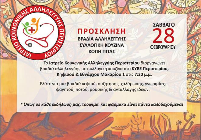 Το ιατρείο Κοινωνικής Αλληλεγγύης Περιστερίου διοργανώνει βραδυά αλληλεγγυής με συλλογική κουζίνα.το Σάββατο 28 Φεβρουαρίου και ώρα 7.30 μ.μ στο ΚΥΒΕ Περιστερίου ,Κηφισού & Εθνάρχου Μακαρίου 1.