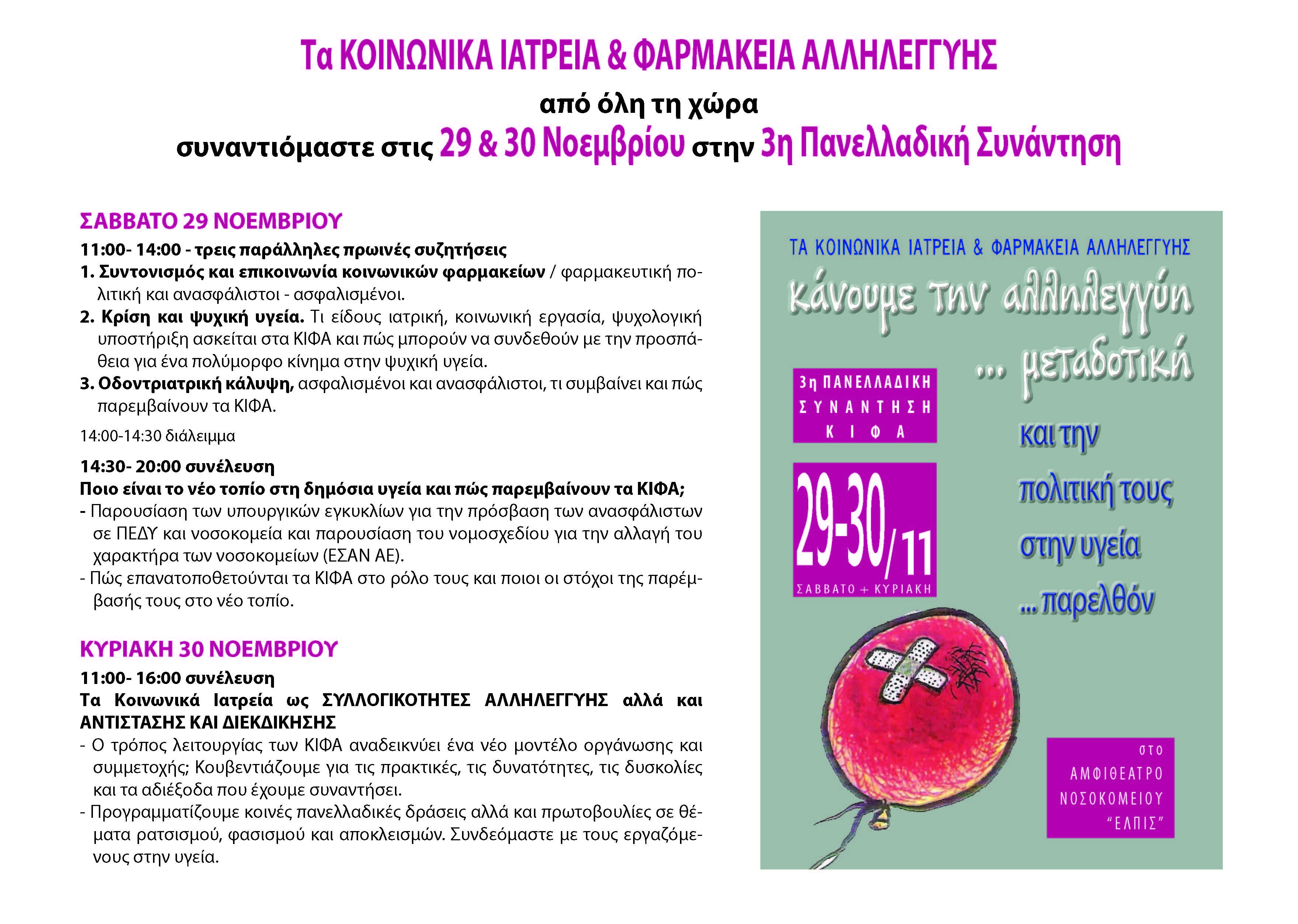 3η ΠΑΝΕΛΛΑΔΙΚΗ ΣΥΝΑΝΤΗΣΗ ΚΟΙΝΩΝΙΚΩΝ ΙΑΤΡΕΙΩΝ & ΦΑΡΜΑΚΕΙΩΝ ΑΛΛΗΛΕΓΓΥΗΣ 29 & 30 ΝΟΕΜΒΡΙΟΥ