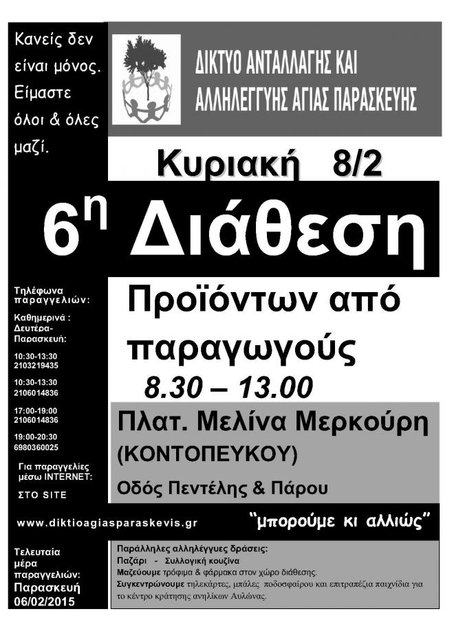 Το δίκτυο Ανταλλαγής και Αλληλεγγύης Αγίας Παρασκευής, διοργανώνει την Κυριακή 8/2 (8.30 έως 13.00), την 6η Διάθεση προιόντων χωρίς μεσάζοντες στην Πλατεία Μελίνα Μερκούρη (Κοντοπεύκου). Παράλληλα, θα υπάρχει το παζάρι ενίσχυσης του Δικτύου, το καλάθι αλληλεγγύης, οπου θα μαζεύουμε τρόφιμα και φάρμακα για συμπολίτες μας που έχουν ανάγκη και για το κοινωνικό φαρμακείο, καθώς και είδη για τις φυλακές ανηλικών Αυλώνας (μπάλες, επιτραπέζια, τηλεκάρτες κλπ). Στο χώρο θα λειτουργεί και συλλογική κουζίνα με μεζέδες και ποτό.