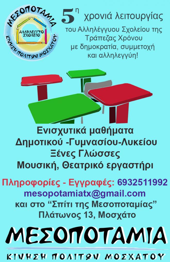 Μετά από τέσσερα χρόνια λειτουργίας του Αλληλέγγυου Σχολείου της Μεσοποταμίας με δημοκρατία, συμμετοχή και αλληλεγγύη, συνεχίζουμε. Για ακόμα μια χρονιά, στηρίζουμε τις εκπαιδευτικές ανάγκες όλων των ηλικιών, συμμετέχουμε, αποφασίζουμε δημοκρατικά, δημιουργούμε.