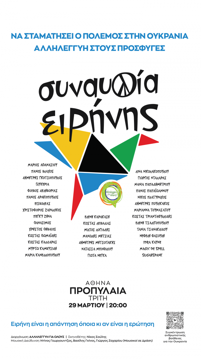 H Αλληλεγγύη για Όλους διοργανώνει την Τρίτη 29 Μαρτίου συναυλία Ειρήνης, για να σταματήσει ο πόλεμος στην Ουκρανία για να προστατευθούν οι άμαχοι και οι πρόσφυγες πολέμου για να αποχωρήσει ο στρατός του Πούτιν από την Ουκρανία.