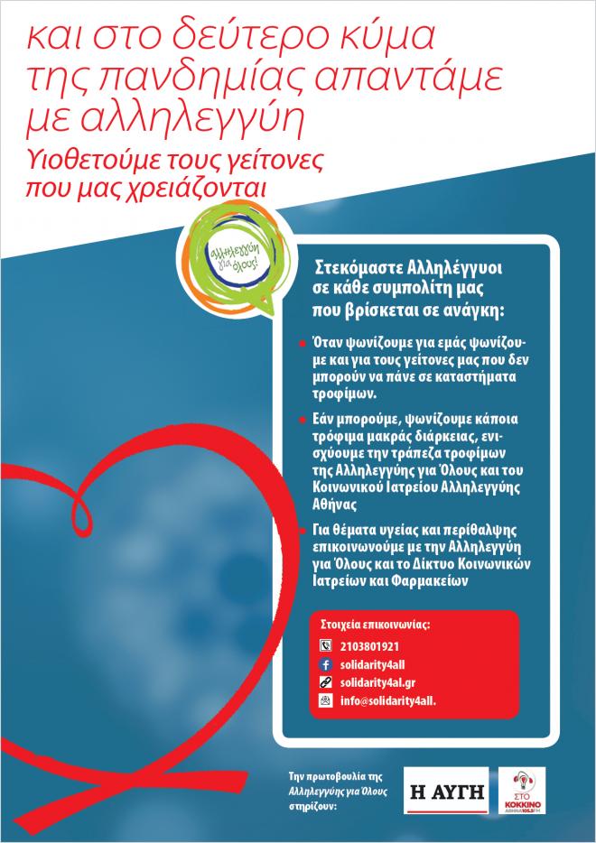 “Solidarity for All” is resuming the campaign which started during the difficult days of last spring’s lockdown and is continuing now, to even more difficult conditions; to support once again the vulnerable and socially disadvantaged who are deeply affected by the social and economic impact of this pandemic crisis.