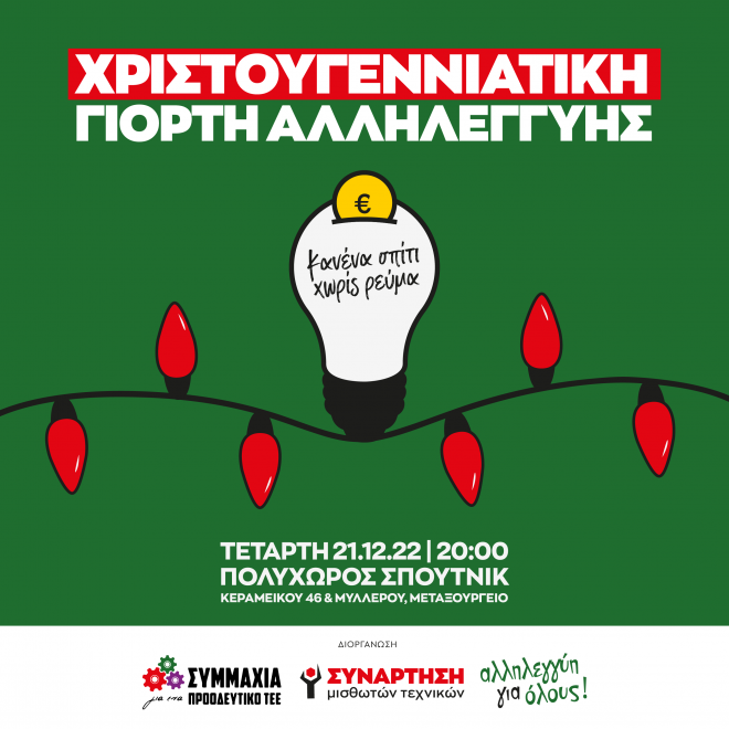 Σε μία συγκυρία που πολλαπλασιάζονται οι διακοπές ηλεκτροδότησης σε ευάλωτα νοικοκυριά η Συνάρτηση μισθωτών τεχνικών, η Συμμαχία για Προοδευτικό Τ.Ε.Ε και η Αλληλεγγύη για Όλους, διοργανώνουν Χριστουγεννιάτικη Γιορτή Αλληλεγγύης «Κανένα σπίτι χωρίς ρεύμα» την 21 Δεκεμβρίου στις 20.00 στον πολυχώρο Σπούτνικ, Κεραμεικού 46, Αθήνα.