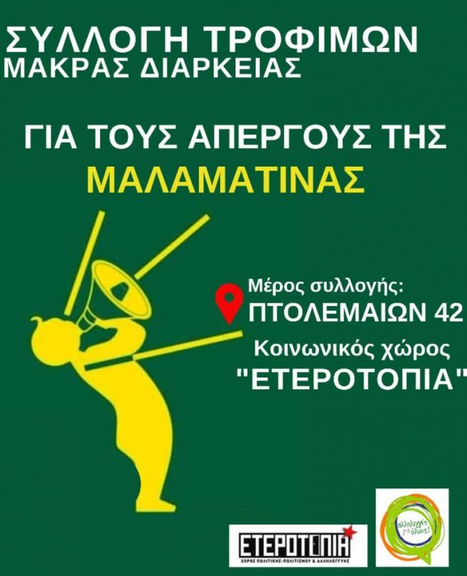 Εδώ και μεγάλο διάστημα οι απεργοί της Μαλαματίνας, δίνουν έναν μεγάλο αγώνα ενάντια στην εργοδοτική τρομοκρατία και στην βία των δυνάμεων των ΜΑΤ. Η ανάγκη για υλική στήριξη των απεργών είναι υψίστης σημασίας τόσο για την τόνωση του ηθικού τους, όσο και για την κάλυψη των βιοτικών τους αναγκών οι οποίες τρέχουν εν μέσω της απεργιακής τους κινητοποίησης.