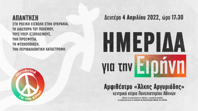 Στον απόηχο της μεγάλης αντιπολεμικής συναυλίας που διοργανώθηκε στις 29/3 στα Προπύλαια, όπου ήταν καθοριστική η συμμετοχή των ανθρώπων του Πολιτισμού και της νεολαίας, η Πρωτοβουλία για την Ειρήνη διοργανώνει ημερίδα με τη φιλοδοξία να αποτελέσει την αφετηρία μιας μεγάλης προσπάθειας να υπάρξει ένα κίνημα ειρήνης στη χώρα μας, ως απάντηση στη ρωσική εισβολή στην Ουκρανία, τη διάχυση του πολέμου, τους υπερ-εξοπλισμούς, την προσφυγιά, τη φτωχοποίηση και την περιβαλλοντική καταστροφή. Μαζί με την αμέριστη Αλληλεγγύη στα θύματα και τους πρόσφυγες του ουκρανικού λαού και τις γενναίες αντιπολεμικές φωνές στη Ρωσία, να ακουστεί η φωνή των μεγάλων πανανθρώπινων αξιών, η φωνή της Ειρήνης. a