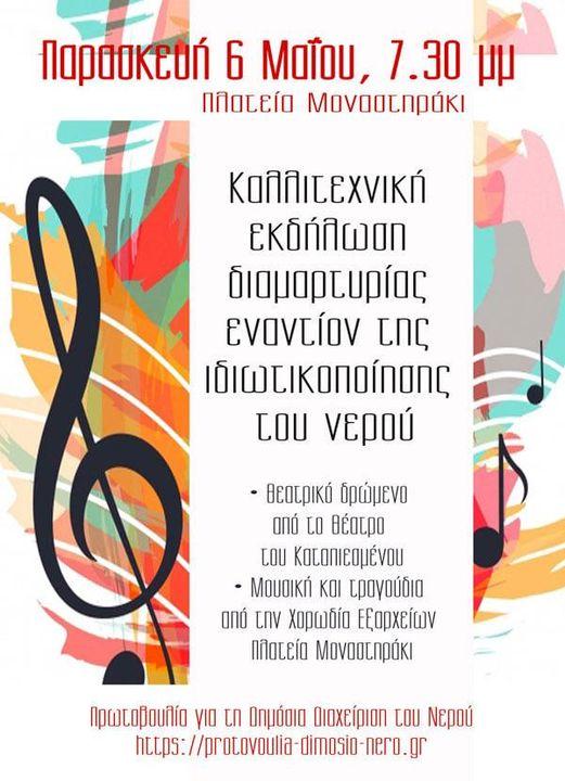 Στις 6 του Μάη στις 7.30 μ.μ. στο Μοναστηράκι, στην πλατεία μπροστά από την είσοδο του Μετρό, οργανώνουμε εκδήλωση διαμαρτυρίας και αγώνα για την αποτροπή της ιδιωτικοποίησης του νερού.