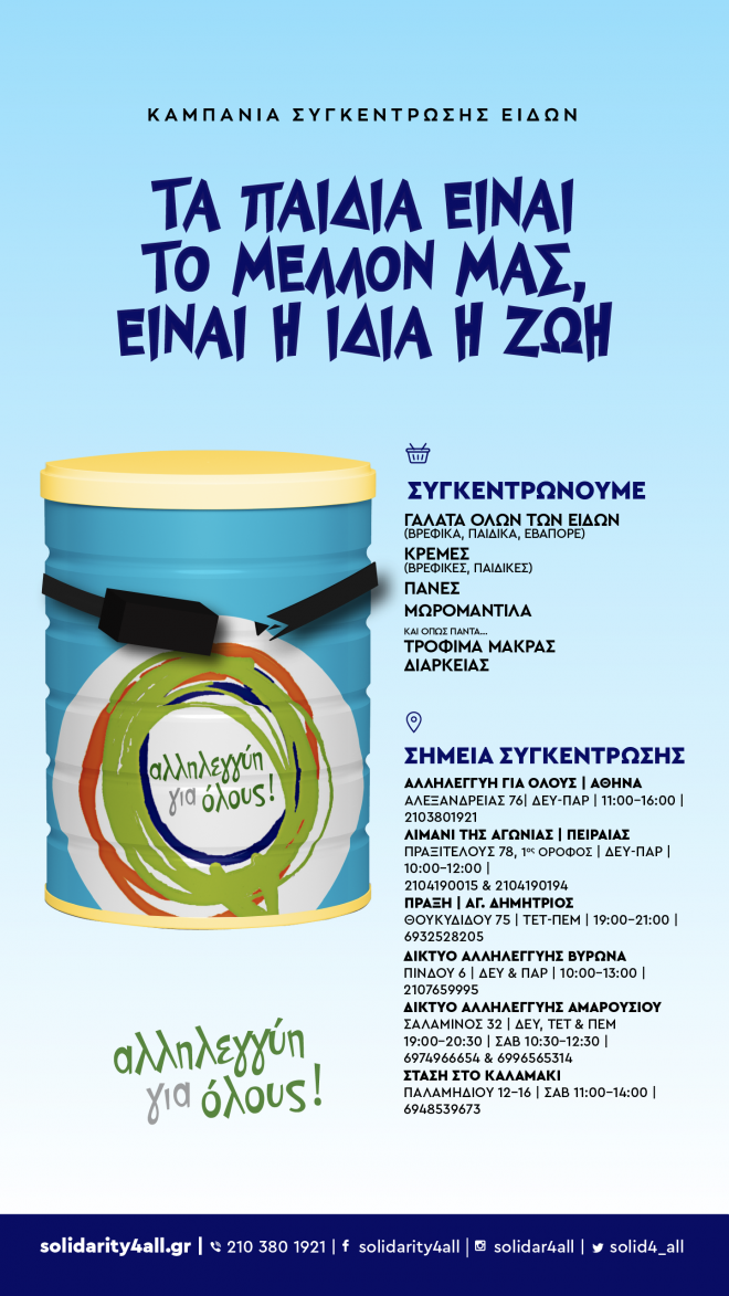 Σε αντίδραση αυτής της ζοφερής κατάστασης που εκτυλίσσεται η "Αλληλεγγύη για Όλους" διοργανώνει καμπάνια συλλογής ειδών για να μη λείψει τίποτα από κανένα σπίτι.