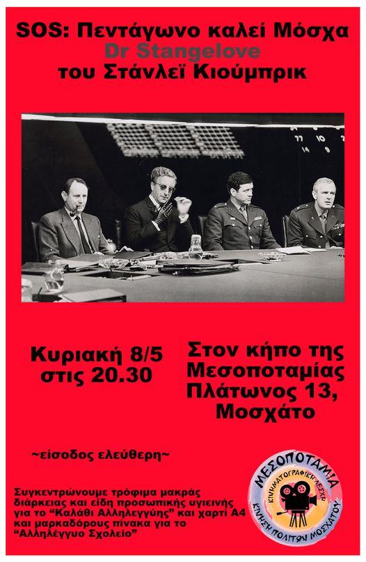 Την Κυριακή 8 Μαΐου στις 20.30 θα γίνει προβολή της ταινίας "SOS Πεντάγωνο καλεί Μόσχα", του Στάνλεϊ Κιουμπρικ, με τους Πίτερ Σέλερς, Τζορτζ Σ. Σκοτ, Στέρλινγκ Χέιντεν, Κίναν Γουίν, Τζέιμς Ερλ Τζόουνς.