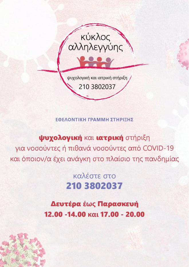 Ο Κύκλος Αλληλεγγύης είναι μια τηλεφωνική γραμμή συμβουλευτικής στήριξης μέσα στην πανδημία του COVID-19, η οποία, παρά το πολύ σημαντικό βήμα που συνιστά ο εμβολιασμός, δυστυχώς δεν έχει τελειώσει ακόμα. Ο Κύκλος θα παρέχει ψυχολογική και ιατρική στήριξη για νοσούντες ή πιθανά νοσούντες από COVID-19 και όποιον/α έχει ανάγκη στο πλαίσιο της πανδημίας.