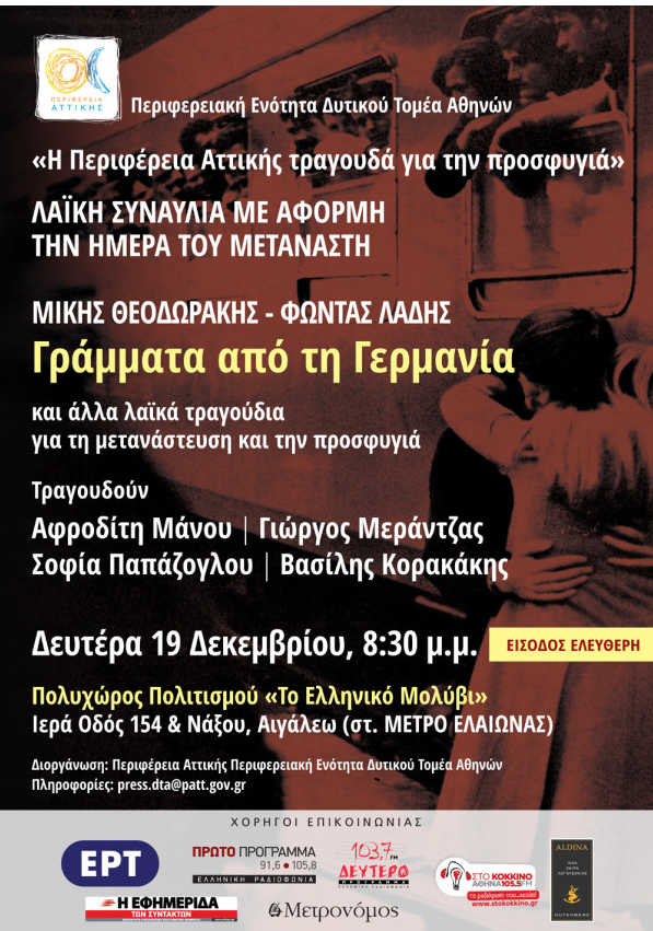 Μεγάλη συναυλία με την ευκαιρία της φετινής Παγκόσμιας Ημέρας Μετανάστη διοργανώνει στις 19 Δεκεμβρίου ο Δυτικός Τομέας της Περιφέρειας Αττικής με ελεύθερη είσοδο για το κοινό.