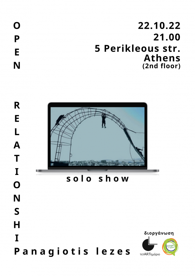Το τετARTημόριο και η «Αλληλεγγύη για Όλους», σας προσκαλούν το Σάββατο 22 Οκτωβρίου στις 21:00, στην εικαστική δράση του Παναγιώτη Λεζέ, με τίτλο Open Relationship. Περικλέους 5, Αθήνα (3 στενά από το metro Συντάγματος) δεύτερος όροφος.