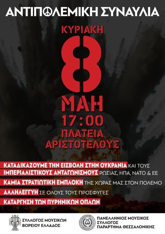 Με αφορμή τη μεγάλη αντιπολεμική συναυλία της Θεσσαλονίκης, ο Σύλλογος Μουσικών Βορείου Ελλάδος (ΣΜΒΕ) από κοινού με τον Πανελλήνιο Μουσικό Σύλλογο (ΠΜΣ), καλεί αδελφά σωματεία και συλλογικότητες σε όλη την Ελλάδα να διοργανώσουν αντιπολεμικές δράσεις πολιτισμού το διήμερο 7-8 Μάη, μετατρέποντάς το σε ΠΑΝΕΛΛΑΔΙΚΟ ΔΙΗΜΕΡΟ ΑΝΤΙΠΟΛΕΜΙΚΩΝ ΔΡΑΣΕΩΝ.