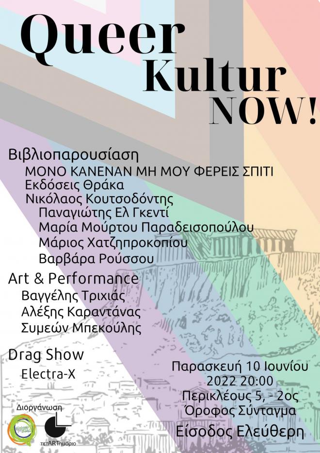 Το τετARTημόριο και η «Αλληλεγγύη για Όλους», σας προσκαλούν την Παρασκευή 10 Ιουνίου 2022, και ώρα 20:00, στο πολυγεγονός Queer πολιτισμού “Queer Kultur – NOW!”. Συνάντηση Περικλέους 5 (στον 2ο όροφο), Αθήνα -3 στενά από το metro Συντάγματος.