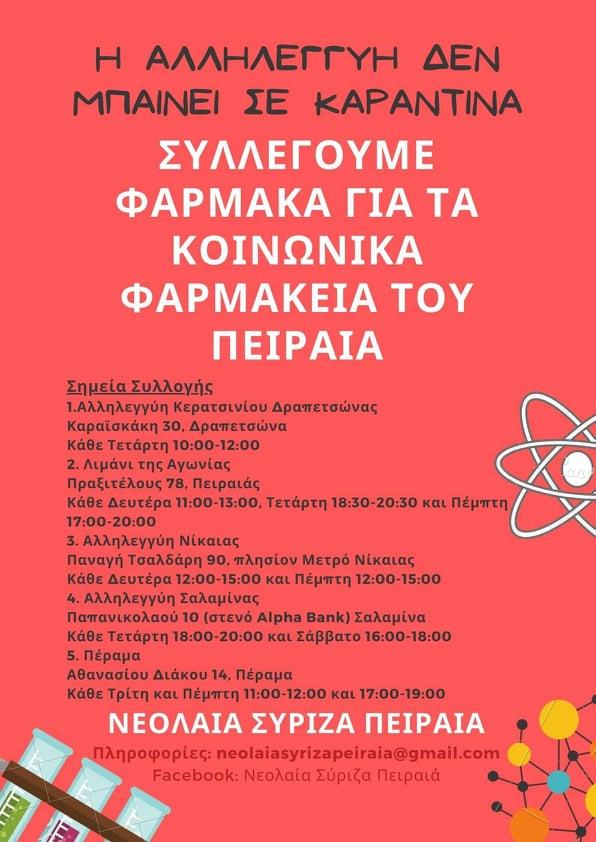 Οι γειτονιές του Πειραιά είναι από τις πιο βαριά πληττόμενες από την κρίση που ζούμε. Πολλοί άνθρωποι δεν έχουν ούτε τα βασικά, δεν έχουν τα χρήματα να αγοράσουν τα φάρμακα που χρειάζονται, σε μία περίοδο που η ανθρώπινη ζωή και υγεία τίθενται σε κίνδυνο. Τα κοινωνικά φαρμακεία κρατούν όρθιο ένα μεγάλο κομμάτι των πιο ευάλωτων συμπολιτών μας. Οι άνθρωποι αυτοί είναι αόρατοι για την κυβέρνηση. Η αλληλεγγύη είναι το όπλο μας και σε αυτή την κρίση. Συλλέγουμε φάρμακα στα παρακάτω σημεία. οι ανάγκες είναι τεράστιες: χρειάζονται κυρίως τα κάτωθι είδη: