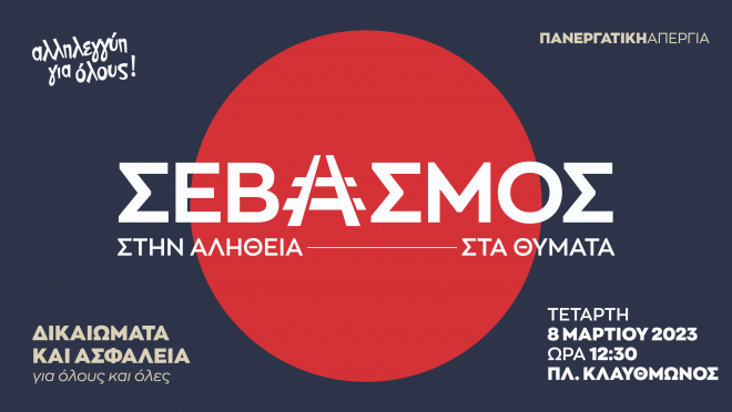 Σας καλούμε να συμμετέχετε στις απεργιακές κινητοποιήσεις της 8ης Μάρτη, που διοργανώνουν πανελλαδικά οι συνδικαλιστικοί φορείς, τα εργατικά σωματεία και οι φεμινιστικές οργανώσεις.