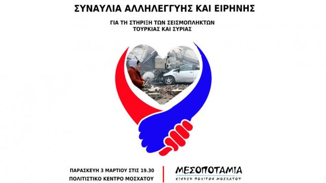 Η Κίνηση Πολιτών Μοσχάτου Μεσοποταμία διοργανώνει συναυλία Αλληλεγγύης για την στήριξη των πληγέντων της Τουρκίας και της Συρίας, την Παρασκευή 3 Μαρτίου στις 19.30 στο Πολιτιστικό Κέντρο Μοσχάτου (Κωνσταντινουπόλεως & Σολωμού).