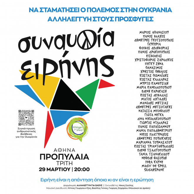 Συναυλία Ειρήνης 29/03 στις 20:00-Να σταματήσει ο πόλεμος στην Ουκρανία Αλληλεγγύη στους πρόσφυγες