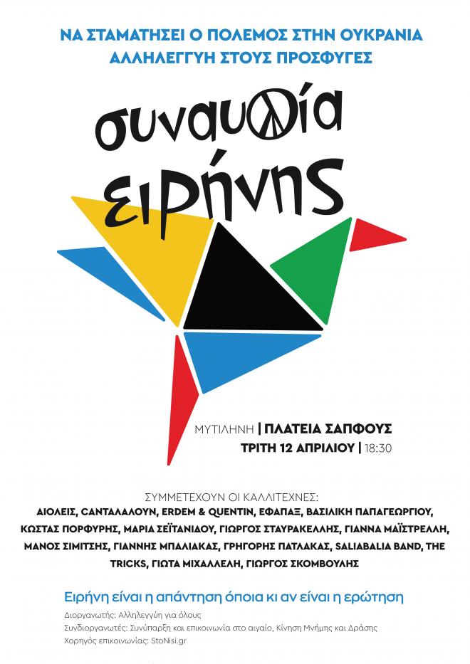 Η «Αλληλεγγύη για Όλους», με την «Συνύπαρξη και επικοινωνία στο Αιγαίο» και την «Κίνηση Μνήμης και δράσης» διοργανώνουν μεγάλη συναυλία για την Ειρήνη, την Τρίτη 12 Απριλίου 2022 στις 18:30 στη πλατεία Σαπφούς.