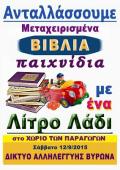 Το Δίκτυο Αλληλεγγύης Βύρωνα διοργανώνει το Σάββατο 12 Σεπτεμβρίου 2015 στο Χωριό των Παραγωγών (απέναντι απο το Δημαρχείο), ανταλλακτικό παζάρι, με στόχο να συγκεντρώσει ελαιόλαδο.Ανταλλάσσουμε...
