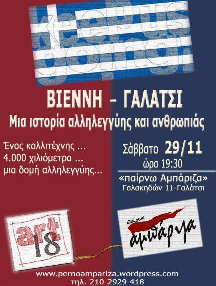 Ο καλλιτέχνης Rainer Neumüller   σε μια προσπάθεια με τίτλο “keep us going” να απεικονίσει την κατάσταση της ελληνικής κοινωνίας εξ αιτίας των μέτρων της τρόϊκα. Ξεκίνησε με ένα ποδήλατο από την ιδιαίτερη πατρίδα του την Βιέννη  στις 10 Ιουλίου 2014 για να φτάσει στο Λονδίνο και να επιστρέψει στις 22 Αυγούστου. Γερμανία, Δανία, Ολλανδία, Βέλγιο, Λονδίνο, Βιέννη . 4.000 χιλιόμετρα χωρίς καθόλου χρήματα στην τσέπη, απλά με ότι υποστήριξη έβρισκε από τους ανθρώπους στον «δρόμο» . Για κάθε χιλιόμετρο που έκανε καλούσε τους ανθρώπους να καταθέσουν ένα ποσό το οποίο θα προορίζονταν για μια δομή αλληλεγγύης στην Ελλάδα.  Η δομή την οποία επέλεξε ήταν ο κοινωνικός και πολιτιστικός «παίρνω Αμπάριζα» και η κίνηση «Αντίστασης και Αλληλεγγύης-χωρίς μεσάζοντες» στο Γαλάτσι. Το Σάββατο 29 Νοεμβρίου 2014 o Rainer Neumüller   θα βρίσκεται,  μαζί με τον δημοσιογράφο της αυστριακής τηλεόρασης Christian Rathner που μεσολάβησε, στο στέκι «παίρνω Αμπάριζα» στις 19:30 σε μια εκδήλωση αλληλεγγύης και ανθρωπιάς .