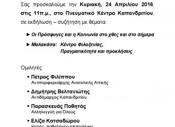 Την Πέμπτη 14 Απριλίου 2016 αντιπροσωπεία του Δικτύου Αλληλεγγύης Ενεργών Πολιτών Νέου Ψυχικού – Φιλοθέης – Ψυχικού, αποτελούμενη από την Επικεφαλής και Δημοτική Σύμβουλο Νάντια Σουμπασάκη και τα μέλη Αυλωνίτη Σπύρο, Κωστούλα Γιώργο, Παπαναστασίου Γιάννη, Σαβρανάκη Γιώργο, Σαβρανάκη Κωνσταντίνο και Σολομών Ιλάν, συναντήθηκε με τη Δομή Αλληλεγγύης Λαυρίου και συνδέσμους της περιοχής Λαυρίου, που εκπροσωπούνταν από τους κ.κ. Μώρογλου Αντώνη και Σκουλαρίτη Σωτήρη και παρέδωσαν στον καταυλισμό των Κούρδων προσφύγων τρόφιμα, είδη προσωπικής υγιεινής, είδη καθαρισμού και παπούτσια.