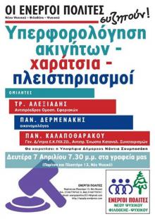 Οι ΕΝΕΡΓΟΙ ΠΟΛΙΤΕΣ συζητουν για Υπερφορολόγηση Ακινήτων-Χαράτσια-Πλειστηριασμούς Δομή: "Ενεργοί Πολίτες Νέου Ψυχικού-Φιλοθέης-Ψυχικού " Δίκτυο Αλληλεγγύης Monday, 7 April, 2014 - 19:30 SHARE IT: Tweet