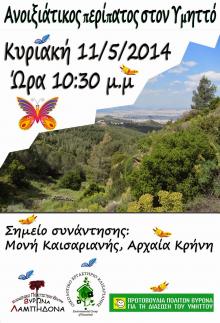 Συνεχίζοντας την προσπάθεια καλύτερης γνωριμίας με το βουνό μας και το φυσικό του πλούτο, για άλλη μια φορά, και φέτος την άνοιξη το Κοινωνικό-Πολιτιστικό Κέντρο Βύρωνα, το Οικολογικό Εργαστήριο Καισαριανής και η Πρωτοβουλία Πολιτών Βύρωνα για τη Διάσωση του Υμηττού σας προσκαλούμε σε: