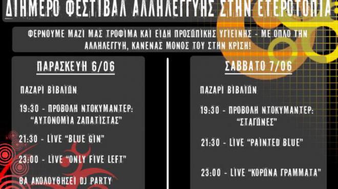 Επειδή κανείς δεν πρέπει να μένει μόνος του στην κρίση οι νεολαίοι-ες της ΕΤΕΡΟΤΟΠΙΑΣ οργανώνουν διήμερο αλληλεγγύης ΣΗΜΕΡΑ Παρασκευή και, αύριο, Σάββατο για την συγκέντρωση τροφίμων και ειδών προσωπικής υγιεινής. Θα υπάρχουν επίσης: παζάρι βιβλίων, προβολές ταινιών, συναυλίες και προβολές ταινιών.