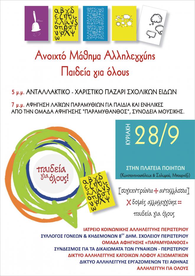 Στο πλαίσιο αυτής της καμπάνιας σας καλούμε να συμμετέχετε με τα παιδιά σας στο  Ανοιχτό Μάθημα Αλληλεγγύης, την ΚΥΡΙΑΚΗ 28/9/2014 ΣΤΗΝ ΠΛΑΤΕΙΑ ΠΟΙΗΤΩΝ (ΚΩΝΣΤΑΝΤΙΝΟΥΠΟΛΕΩΣ & ΣΟΛΩΜΟΥ, ΜΠΟΥΡΝΑΖΙ) με