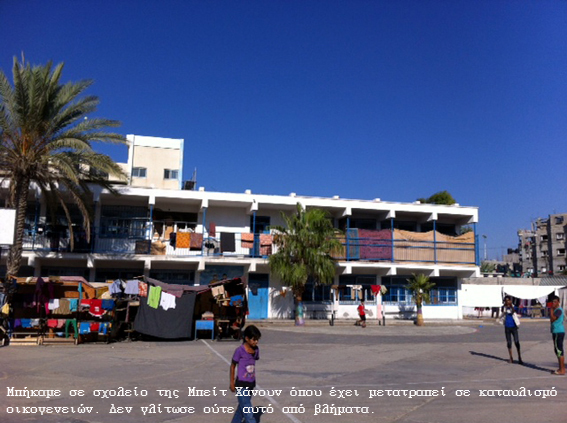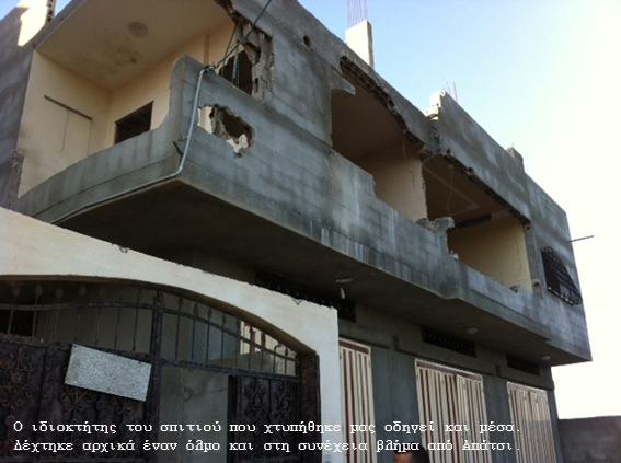 Μεγάλο μέρος της πόλης Beit Hanoun δεν είναι πια μια πόλη αλλά μια έκταση από χαλάσματα, γκρεμισμένα σπίτια, αυτοσχέδιες παράγκες για να κοιμούνται οικογένειες. Μεγάλοι και παιδιά μας έδειχναν τον τόπο που ήταν το σπίτι τους πριν τον βομβαρδισμό και μας εξηγούσαν πως προσπαθούν να επιβιώσουν καθημερινά. Συγκίνηση, θλίψη αλλά και χαμόγελο που μας βλέπουν, εναλλάσσονται στα πρόσωπα τους, αλλά και στα δικά μας. Οι μεγάλοι μιλούν, τα παιδιά μας οδηγούν μέσα στα χαλάσματα και μας δείχνουν.