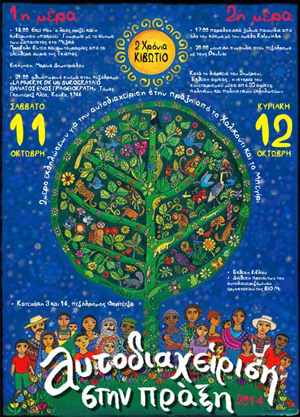 Στις 11-12 Οκτωβρίου 2014 θα πραγματοποιηθούν τα εορταστικά γενέθλια του συνεταιρισμού του κιβωτίου. Φέτος, η κεντρική εισήγηση στο 2 ήμερο εορτασμού των γενεθλίων έχει τίτλο ”Εκεί που ο λαός ορίζει και η κυβέρνηση υπακούει”. Η Μ.Δ θα μας ταξιδέψει στα oμιχλώδη βουνά του νότιου Μεξικού στην πολιτεία των Τσιάπας. Οι Ζαπατίστας, που φέτος συμπληρώνουν 20 χρόνια από την ένοπλη εξέγερση, συνεχίζουν έχοντας ήδη δημιουργήσει δικά τους αυτόνομα συστήματα δικαιοσύνης, υγείας και παιδείας. Είναι αυτοί που κρύψανε τα πρόσωπά τους για να μπορέσουμε όλοι εμείς να τους δούμε. Η εξέγερση των Ζαπατίστας, είναι για αυτούς που έχουν επιλέξει να αντιστέκονται απέναντι στον κοινωνικό κανιβαλισμό μία υπενθύμιση: