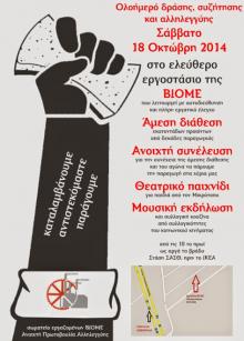 Το Σάββατο στις 18 Οκτωβρίου, μια πολύ σημαντική εκδήλωση θα πραγματοποιηθεί στο εργοστάσιο της ΒΙΟΜΕ. Όλη την ημέρα από τις 10 το πρωί, μέχρι αργά το βράδυ, η αλληλεγγύη θα γεμίσει για μια ακόμη φορά το εργοστάσιο.