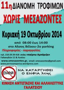 Παρά το ύπουλο χτύπημα της κυβέρνησης Σαμαρά- Βενιζέλου ενάντια στις κινήσεις αλληλεγγύης και το κίνημα “ΧΩΡΙΣ ΜΕΣΑΖΟΝΤΕΣ” με την ψήφιση του νόμου για την “απαγόρευση του υπαίθριου εμπορίου”, η Kίνηση Αντίστασης και Αλληλεγγύης Γαλατσίου ”ΧΩΡΙΣ ΜΕΣΑΖΟΝΤΕΣ” συνεχίζει τις διανομές τροφίμων.
