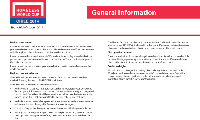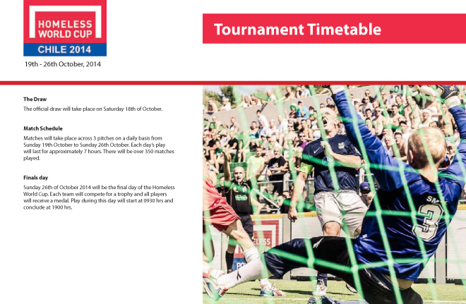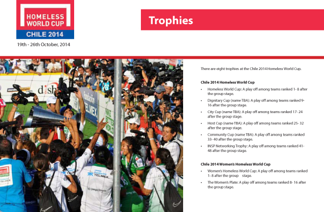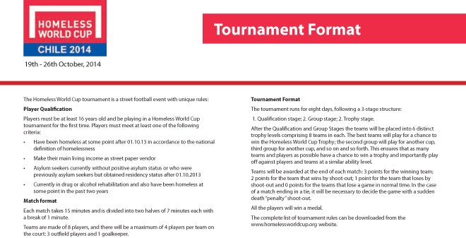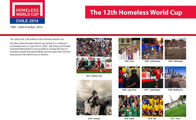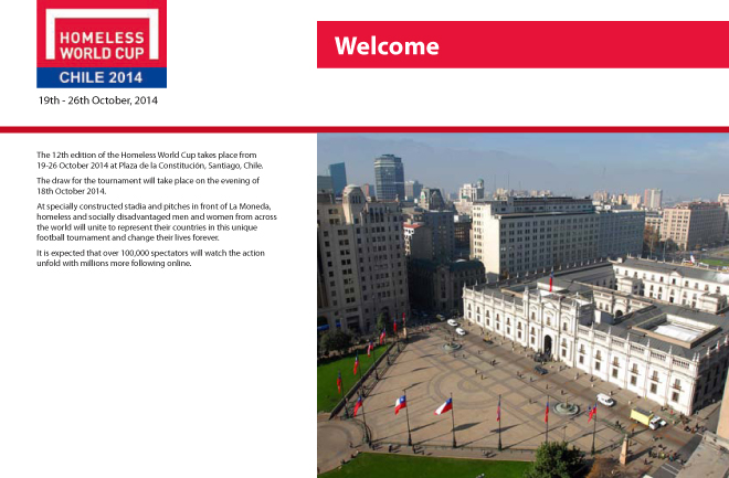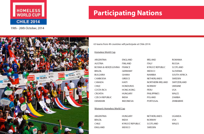 Για την πρωτεύουσα της Χιλής, Σαντιάγκο, συγκεκριμένα, όπου αυτή την Κυριακή 19 Οκτωβρίου «γίνεται η σέντρα» του 12ου Παγκοσμίου Κυπέλλου Αστέγων. Στη φετινή διοργάνωση συμμετέχουν συνολικά 64 ομάδες από 49 συνολικά χώρες. Από την Ινδονησία μέχρι το Περού, από την Γερμανία μέχρι τη Ζάμπια, από την Καμπότζη μέχρι την «πλούσια» Σουηδία, ο στόχος όλων είναι ένας: να φορτώσουμε όλοι μαζί με πολλά γκολ τα δίχτυα της φτώχειας και του κοινωνικού αποκλεισμού.