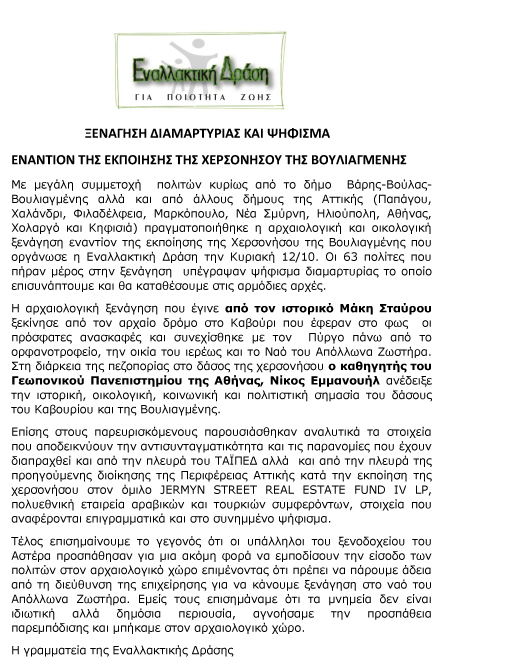 Ξενάγηση διαμαρτυρίας και ψήφισμα εναντίον της εκποίησης της χερσονήσου της Βουλιαγμένης