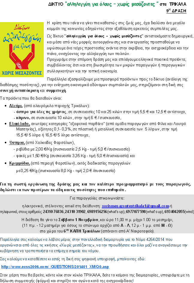 ΔΙΚΤΥΟ ‘’αλληλεγγύη για όλους – χωρίς μεσάζοντες ’’ στα ΤΡΙΚΑΛΑ 9Η ΔΡΑΣΗ
