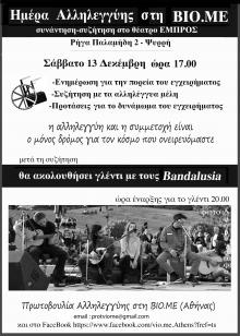 Η Πρωτοβουλία Αλληλεγγύης (Αθήνας) στη ΒΙΟΜΕ σας καλεί σε εκδήλωση ενημέρωσης για τις εξελίξεις γύρω από το εγχείρημα αυτοδιαχείρισης της ΒΙΟΜΕ και συζήτηση για τις παραπέρα δράσεις υποστήριξης, αλληλεγγύης και διάθεσης των προϊόντων. Θα ακολουθήσει γλέντι οικονομικής υποστήριξης.Σάββατο, 13 Δεκέμβρη, στο στο Ελεύθερο Αυτοδιαχειριζόμενο Θέατρο "Εμπρός"