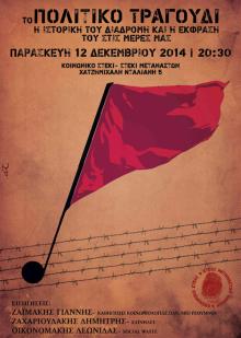 Το Κοινωνικό Στέκι- Στέκι Μεταναστών οργανώνει ανοιχτή συζήτηση την Παρασκευή 12 Δεκεμβρίου στις 20:30 στο χώρο του Στεκιού Χ΄Μιχάλη Νταλιάνη 5 με θέμα: Το πολιτικό τραγούδι η ιστορική του διαδρομή κι η έκφραση του στις μέρες μας.