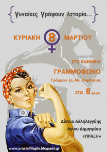 Το Δίκτυο Αλληλεγγύης Αγίου Δημητρίου ΠΡΑΞΗ τιμά την Παγκόσμια Ημέρα της Γυναίκας και διοργανώνει βραδιά γυναικών στο καφενείο «Γραμμόφωνο» (Γράμμου 37, Άγιος Δημήτριος), την Κυριακή 8 Μαρτίου, στις 8 το απόγευμα.