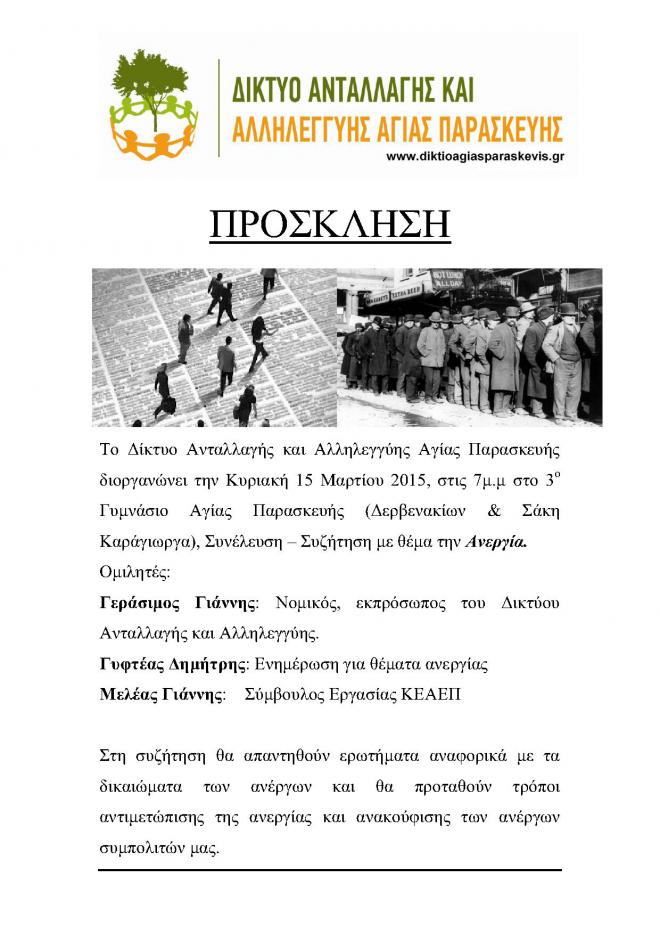 Το Δίκτυο Ανταλλαγής και Αλληλεγγύης Αγίας Παρασκευής σας καλεί σε συζήτηση με θέμα την Ανεργία την Κυριακή 15 Μαρτίου και ώρα 19.00 στο 3ο Γυμνάσιο Αγίας Παρασκευής (Δερβενακίων & Σάκη Καράγιωργα).
